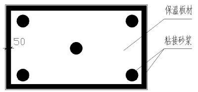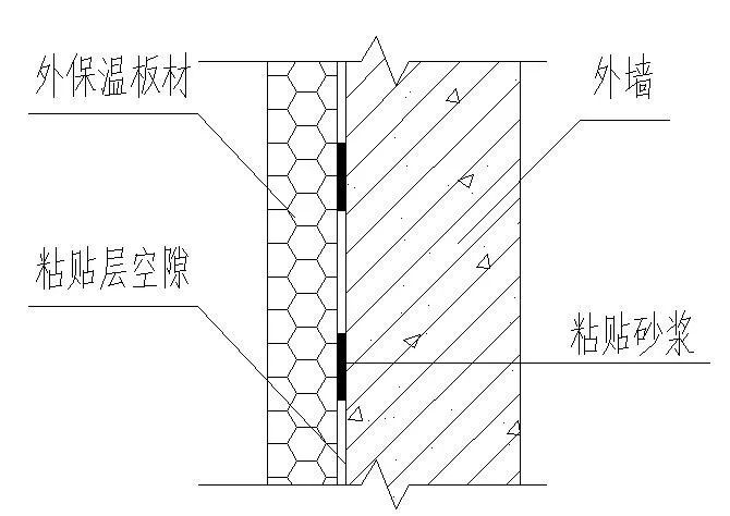 ③粘貼層空腔的施工措施。為防止雨雪水在進入保溫層后,沿著粘貼層的空腔四處流動,在外保溫板材粘貼施工時,必須采用點框粘貼法。在保溫板的四邊涂抹粘貼砂漿,寬度不小于5cm,距板材外邊寬度不大于1cm,使得粘貼砂漿形成一個封閉的框,在框內(nèi)再涂抹5個粘貼砂漿點。這樣既保證了粘貼面積,又使得壓實后的粘貼砂漿擠到板邊,相鄰板材之間沒有空隙,阻斷了滲水的路線。