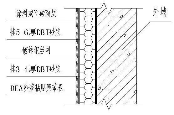 剪力墻結(jié)構(gòu)的高層住宅樓,其外墻外保溫做法一般如圖4所示。該作法中兩道DBI抹面砂漿以及面層的涂料或面磚起到了整體防水的效果。