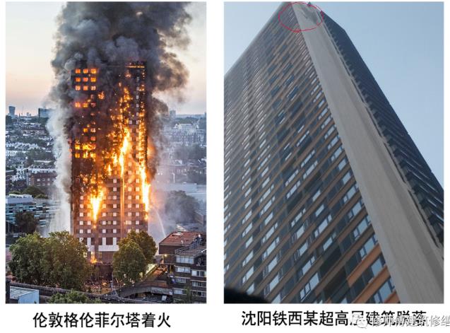 圖五:倫敦格倫菲爾塔和沈陽鐵西廣場某高層建筑都是使用的的聚脲異氰酸酯發(fā)泡板,一個(gè)著火、一個(gè)因?yàn)榉刍撀,可見選用保溫材料及系統(tǒng)應(yīng)該是是非常謹(jǐn)慎的事